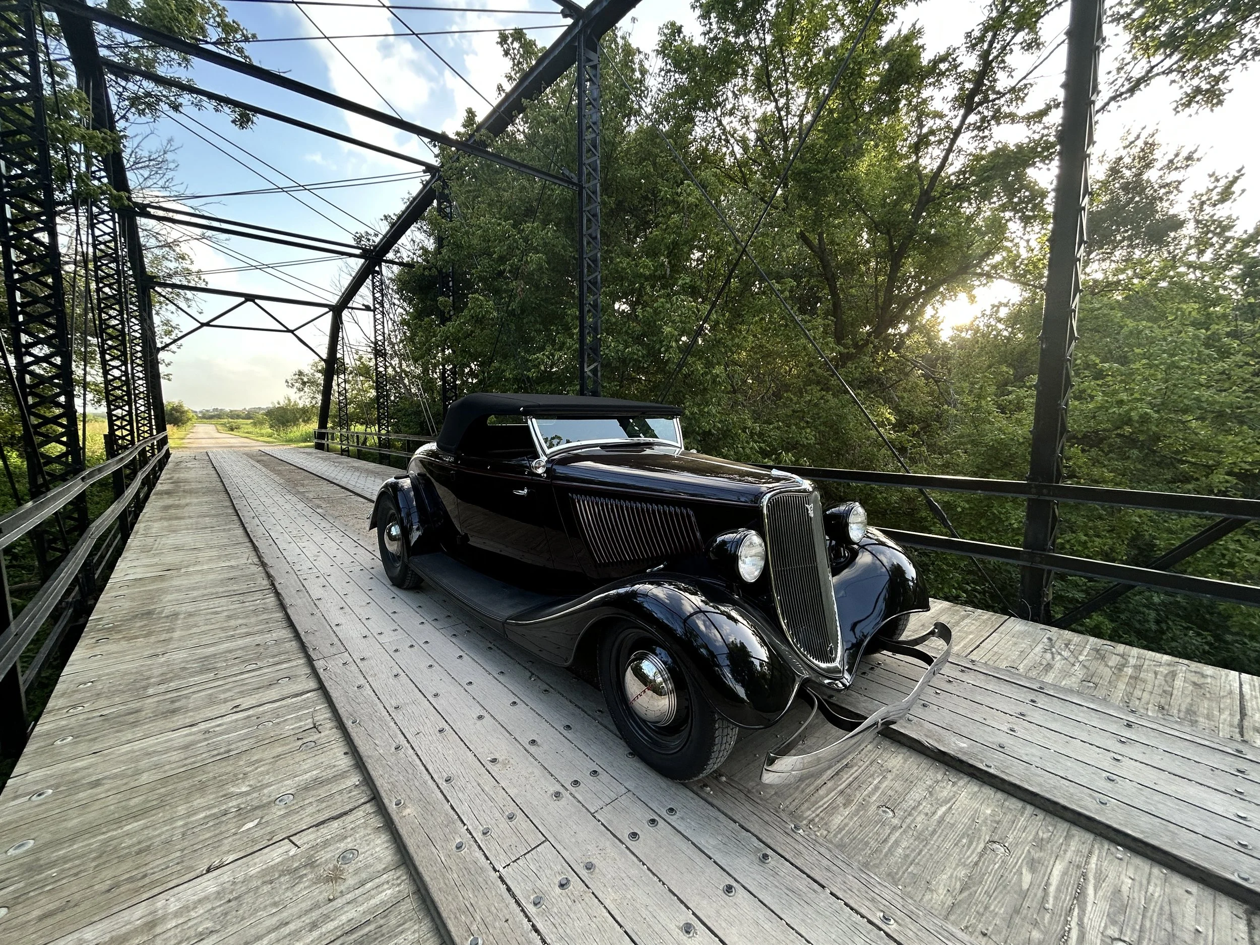 Previously restored as early Ford V8 club car in 1990s. Reimagined as traditional hot rod with reinforced chassis, modernized steering and Lincoln hydraulic brakes. Powered by 8BA flathead V8 with three Stromberg 97 carburetors, 5-speed transmission and '36 Ford rear end. Mercury-inspired details include '47 hubcaps, steering wheel and engine accents. Custom 16-inch steel wheels. Paul Reichlin hand-crafted convertible top with three-inch chop.